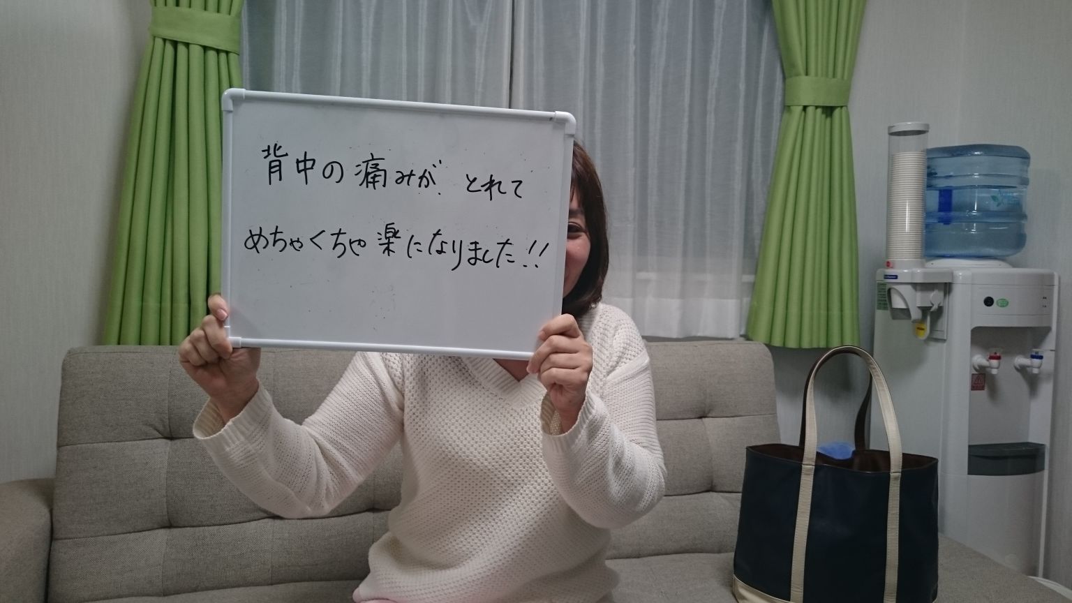 施術が終わって起き上がってもらうと、背中の痛みもなくなり、