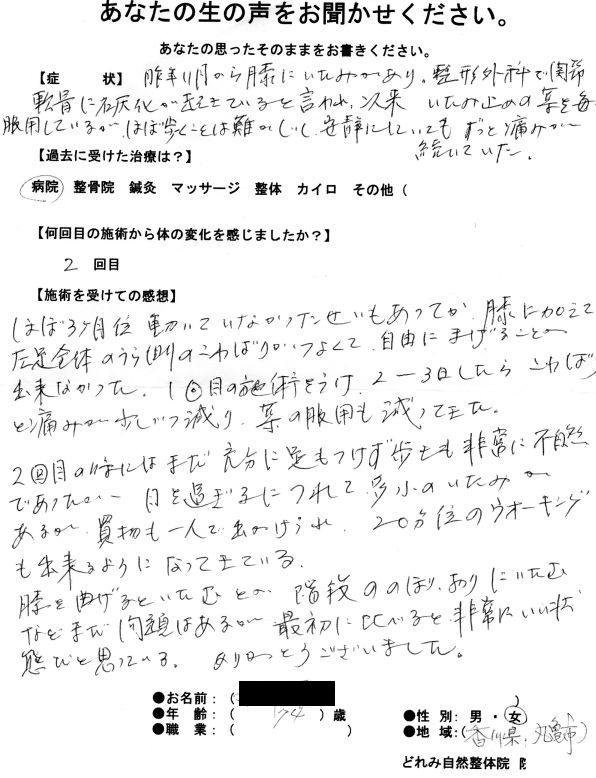 右ひざを以前手術をして結果があまりよくなく、もう二度と手術はしたくないとのことで、近くの治療院にも何度か行っては見たけど、結果が変わらなかったり逆に痛みが増したりだったので再び来院されました。